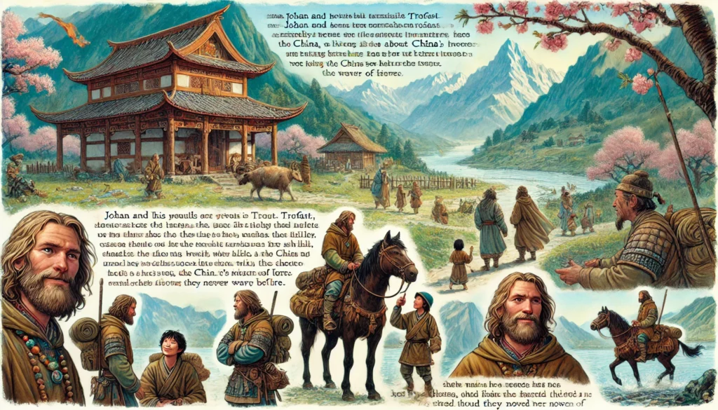 Efter flera månader av prövningar och äventyr, nådde de äntligen den kinesiska gränsen. Johan kunde inte tro sina ögon när han såg de mäktiga bergen och floderna som skiljde Kina från resten av världen. De gick in i landet och möttes av vänliga människor som var nyfikna på deras resa.